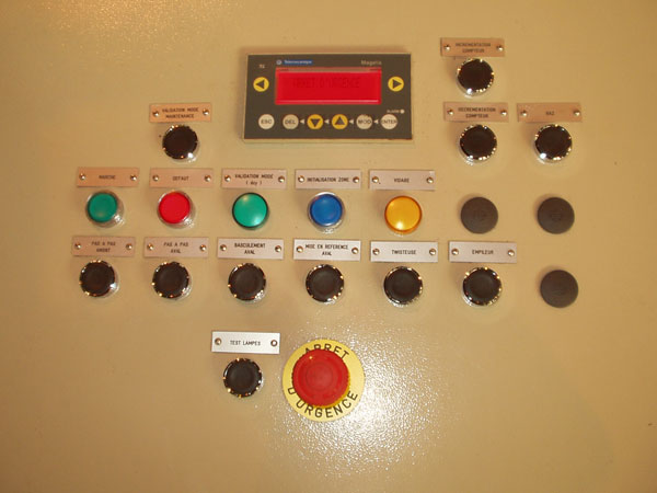 L'installation qui mesure environ 12m*8m est composée de 380 Entrées et sorties TOR. Les deux tiers d'entres elles sont répartis sur la machine grâce à un bus ASI, le reste est utilisé dans l'armoire. La taille de l'installation a justifié l'utilisation d'un bus ASI et la création de zones alimentées par des coffrets de petites tailles afin de limiter les longueurs de câble. Les pupitres de commandes sont équipés de terminaux MAGELIS reliés par un bus unitelway.