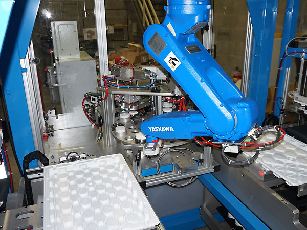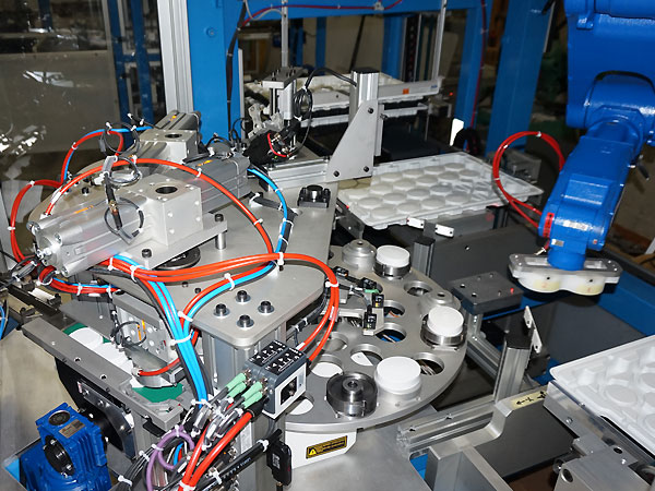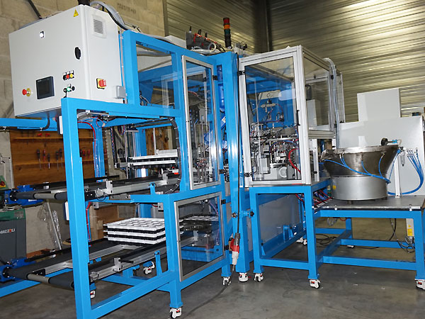 Cette ligne de production se base sur deux éléments standards que nous avons développés avec notre client : un empileur / dépileur de plateaux thermoformés et une cellule robotisée pouvant accueillir 3 ou 5 postes suivant les versions. Elle permet d’assembler de manière entièrement autonome deux pièces primaires l’une étant stockée dans un plateau thermoformé et l’autre distribuée par un bol vibrant. Le robot gère le transfert des pièces entre le dépileur en entrée, la machine d’assemblage et l’empileur en sortie. Il assure également l’orientation et l’évacuation des pièces mauvaises.