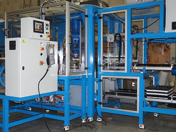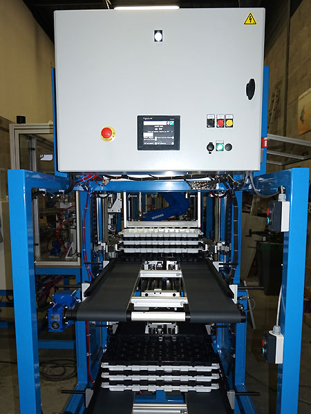L’empileur / dépileur peut aussi bien être intégré à un îlot robotisé que travailler de façon autonome en pied de presse par exemple. Il peut utiliser des plateaux thermoformés allants jusqu’à ???mm de largeur et peut être soit chargé par le haut soit par le bas.
